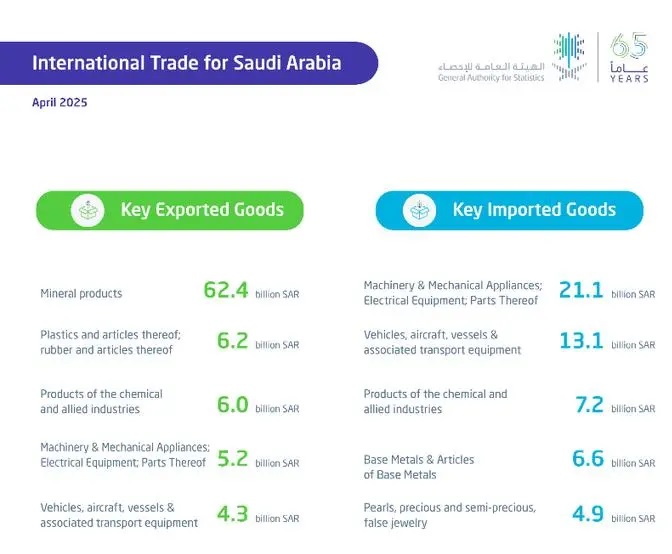 The bulletin also showed that China remained the Kingdom's top trading partner. Exports to China totaled SAR11.4 billion, accounting for 12.6% of total exports in April 2025, while imports from China reached SAR19 billion, representing 25% of total imports for the same month.