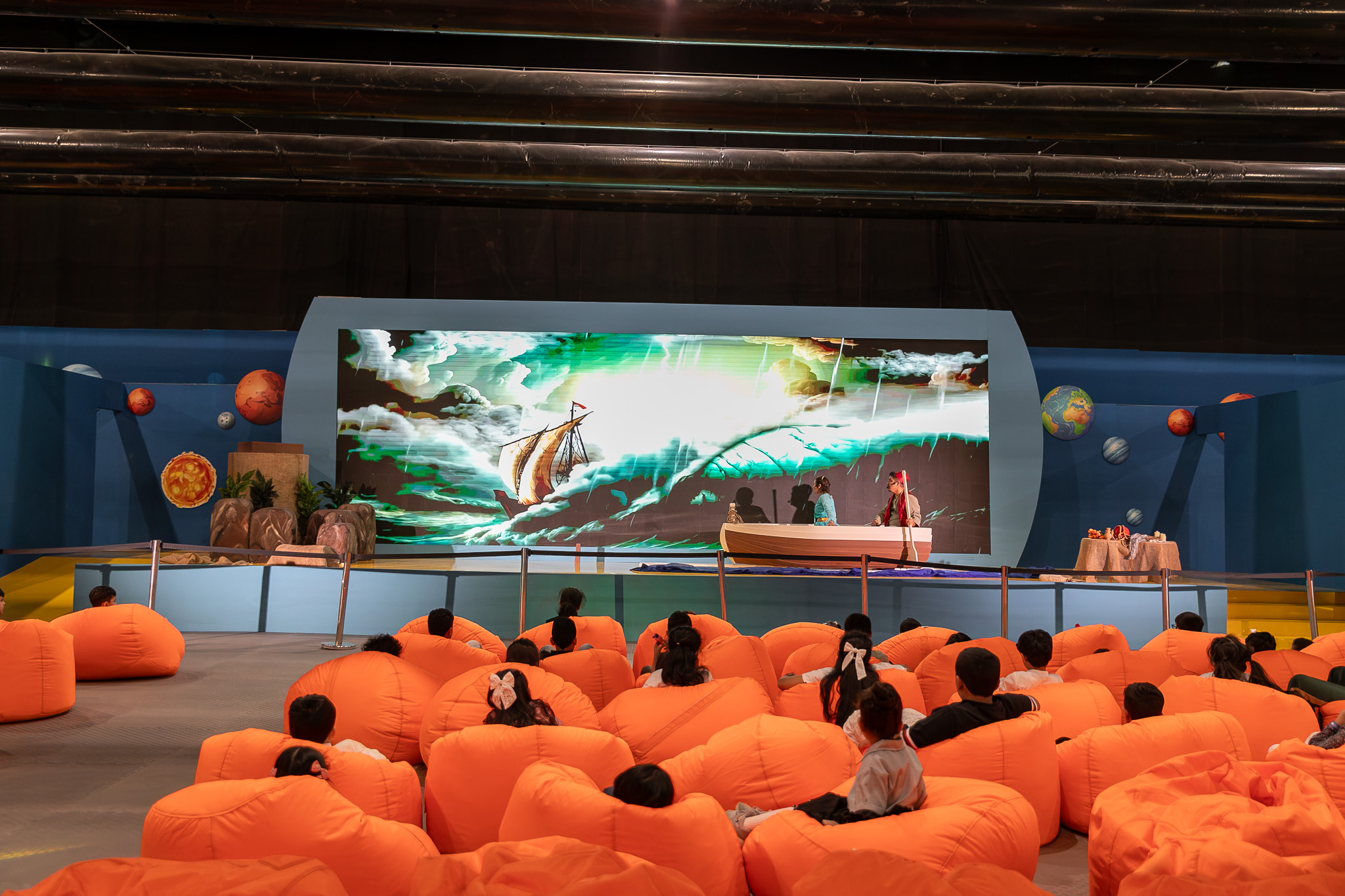 The play “Badr Al-Budour and the Missing Letters” blends music and symbolism to celebrate the Arabic language, following the heroine’s quest to recover lost letters that bring color and life back to the stage. Meanwhile, “Adventure in the Witch’s Book” immerses children in a fantastical setting filled with music, movement, and visual effects inside a giant book-shaped set.