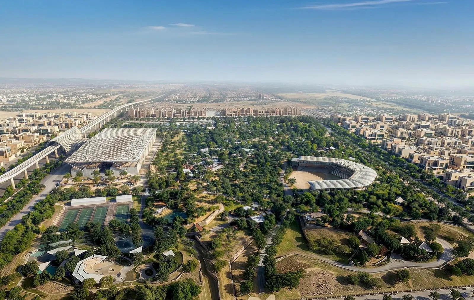The parks will offer a wide range of facilities and amenities, including restaurants and cafés, a golf course, multi-purpose sports fields, water and children’s play areas, jogging tracks, a theater, designated event spaces, and a scenic valley will serve as a central visual and functional element within the parks.