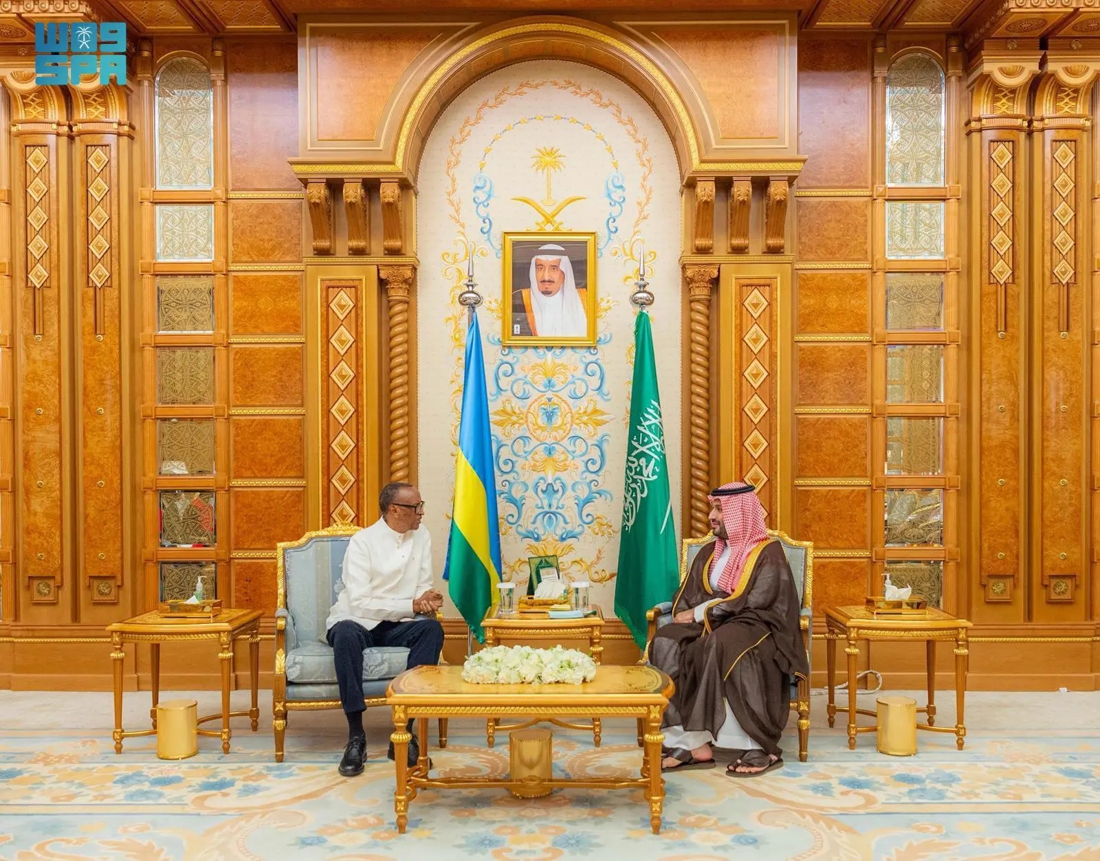 His Royal Highness Prince Mohammed bin Salman bin Abdulaziz Al Saud, Crown Prince and Prime Minister, met with President of the Republic of Rwanda Paul Kagame and his accompanying delegation today on the sidelines of the ninth edition of the Future Investment Initiative (FII9) Conference, held at the King Abdulaziz International Conference Center in Riyadh.