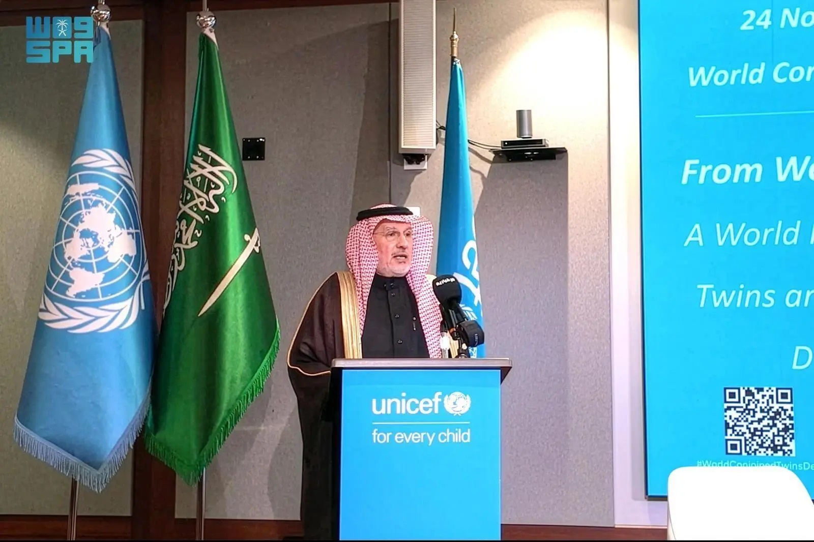 Advisor at the Royal Court and King Salman Humanitarian Aid and Relief Center (KSrelief) Supervisor General Dr. Abdullah Al Rabeeah highlighted the significance of the United Nations designating November 24 as World Conjoined Twins Day, an initiative supported by Custodian of the Two Holy Mosques King Salman bin Abdulaziz Al Saud and His Royal Highness Prince Mohammed bin Salman bin Abdulaziz Al Saud, Crown Prince and Prime Minister, which reflects Saudi Arabia’s commitment to public health and the rights of conjoined twins.