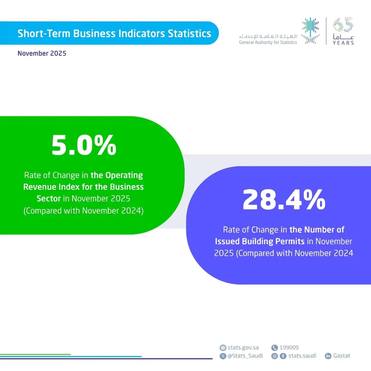 The General Authority for Statistics (GASTAT) reported today in its Short-Term Business Indicators Statistics bulletin that the Kingdom’s Operating Revenue Index rose by 5.0% in November 2025 compared to the same month in 2024.