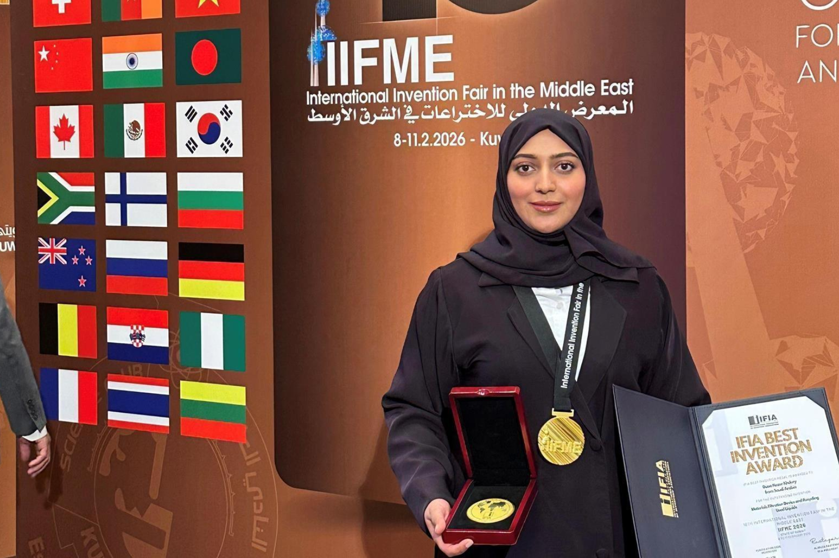 Saudi inventor Duaa Nizar Khudry won two gold medals at the 16th International Invention Fair in the Middle East (IIFME), held in Kuwait from February 8 to 12. Khudry, a member of Mawhiba Alumni, affiliated with King Abdulaziz and His Companions Foundation for Giftedness and Creativity (Mawhiba), was honored for inventing a device that filters materials and recycles used liquids.